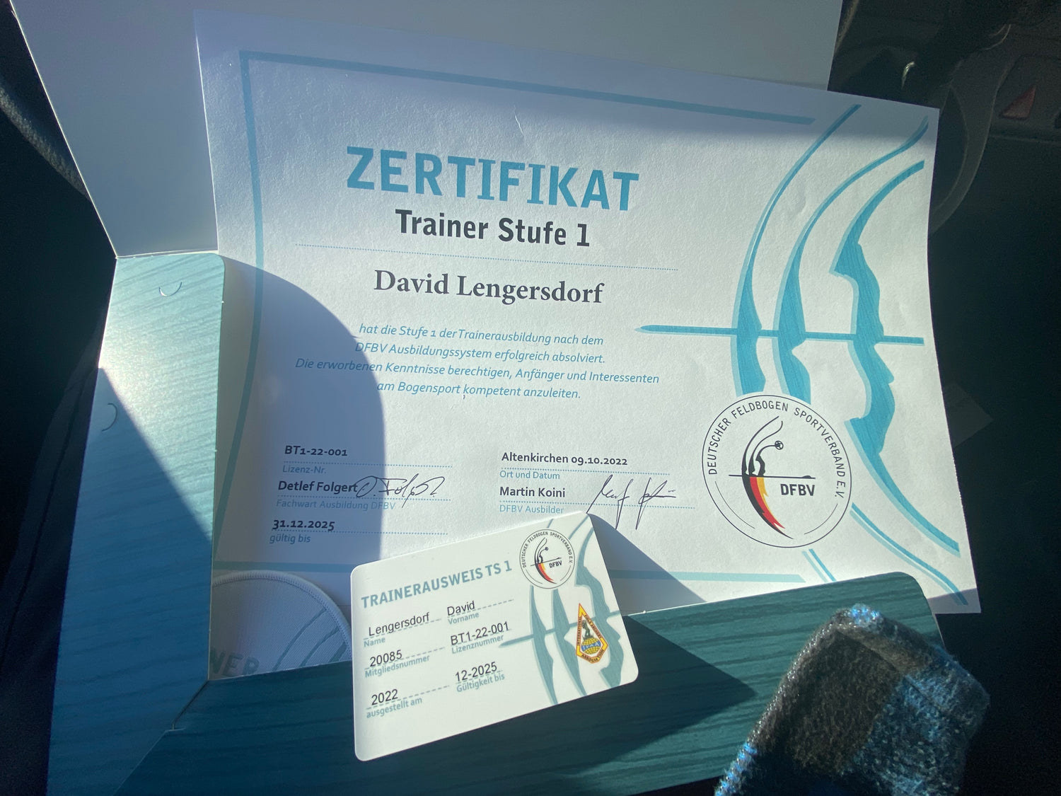 Durch meine Ausbildung zum Trainer beim Deutschen Feldbogen Sportverband e.V. bieten wir einen professionellen Standard für alle Bogenschieß Kurse. Unser Personal hat entweder die entsprechende Ausbildung bei einem offiziellen Verband absolviert, oder ist nachweislich ein erfolgreicher und erfahrener Bogenschütze.